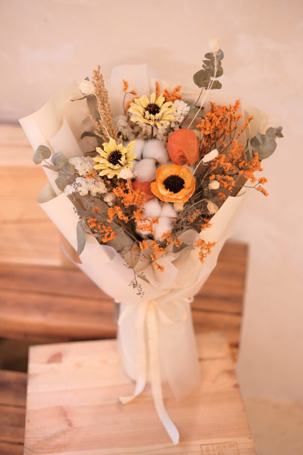 In this everlasting aesthetic bouquet, dried flowers and foliage in yellow and orange shades are the focal point.