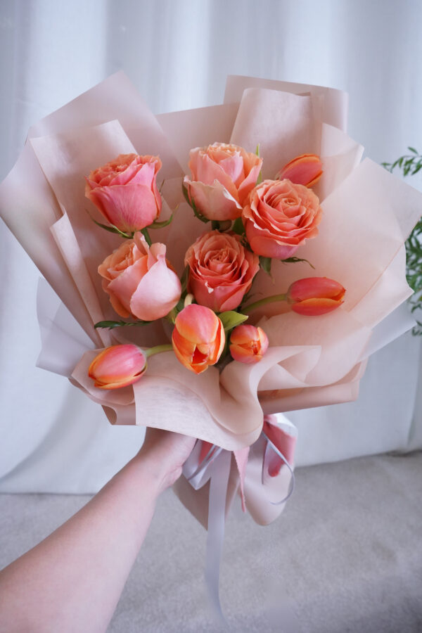 這束花束保證含有鬱金香和各種其他季節性的黃色和橙色的最愛。