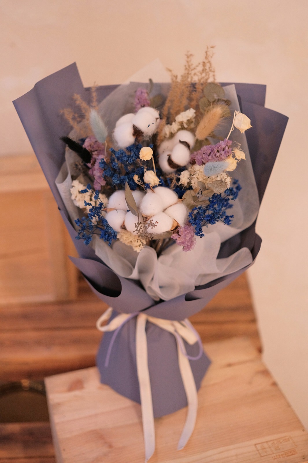 這束永恆的美學花束的核心是藍色和橙色色調的乾花和葉子。